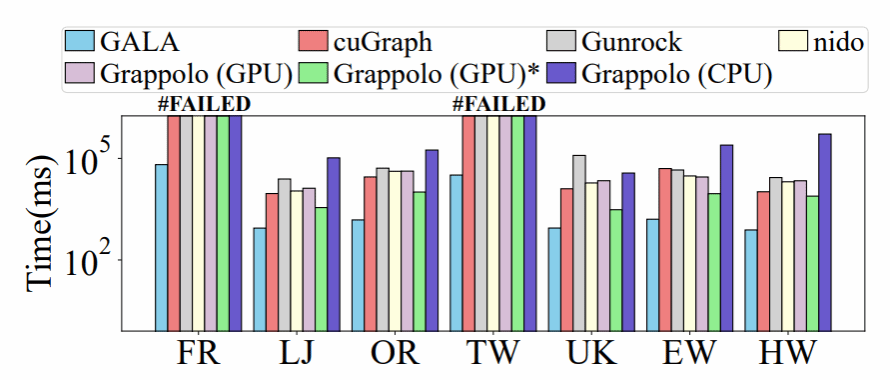 如图 4 所示,我们提出的 GALA 在性能上分别比 cuGraph、Gunrock、nido、Grappolo(GPU)、Grappolo(GPU)* 和 Grappolo(CPU) 平均快 22×、62×、26×、28×、7× 和 288×。GALA 的卓越性能不仅归功于新颖的计算与内存优化策略,还得益于我们高度优化的实现,其充分利用了底层 GPU 硬件架构的优势。此外,GALA能够在大约一分钟内处理两个大规模图数据集(FR 和 TW),而其他实现则遭遇了运行时失败(#FAILED)。