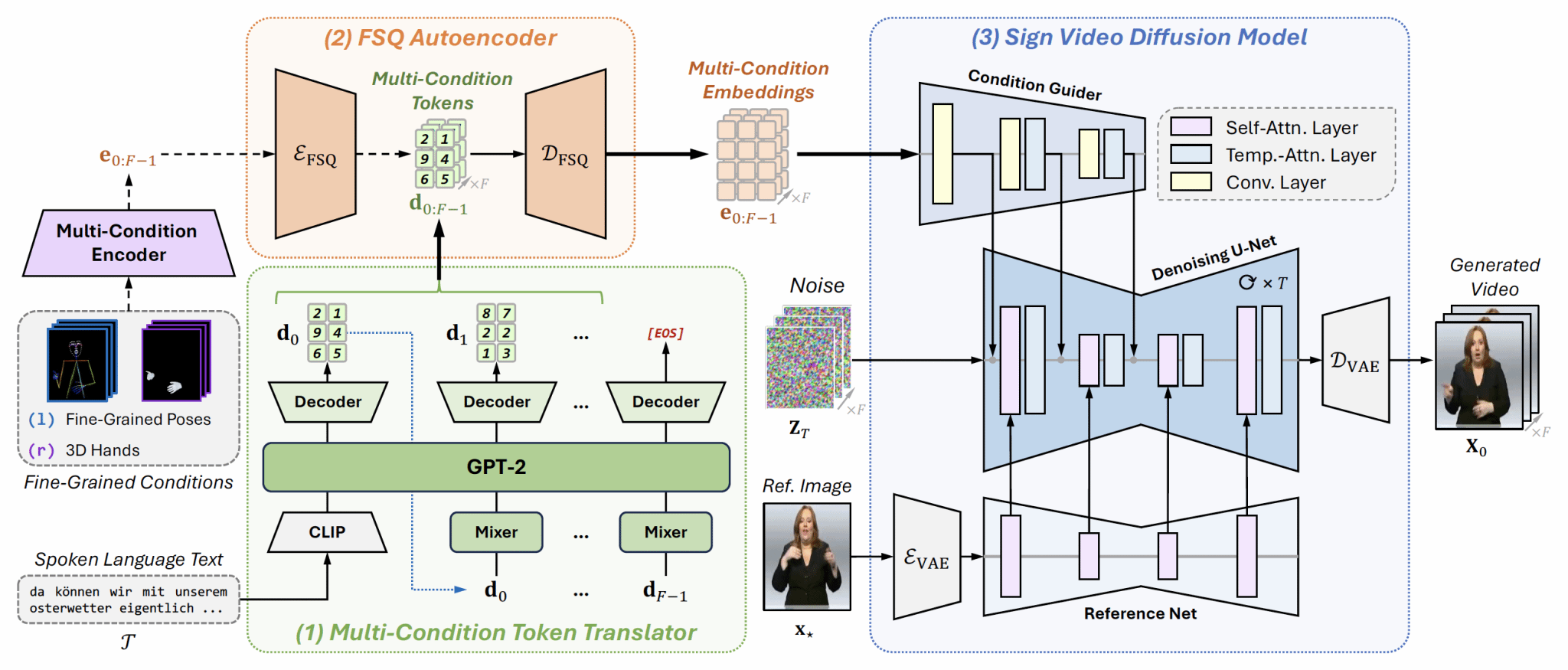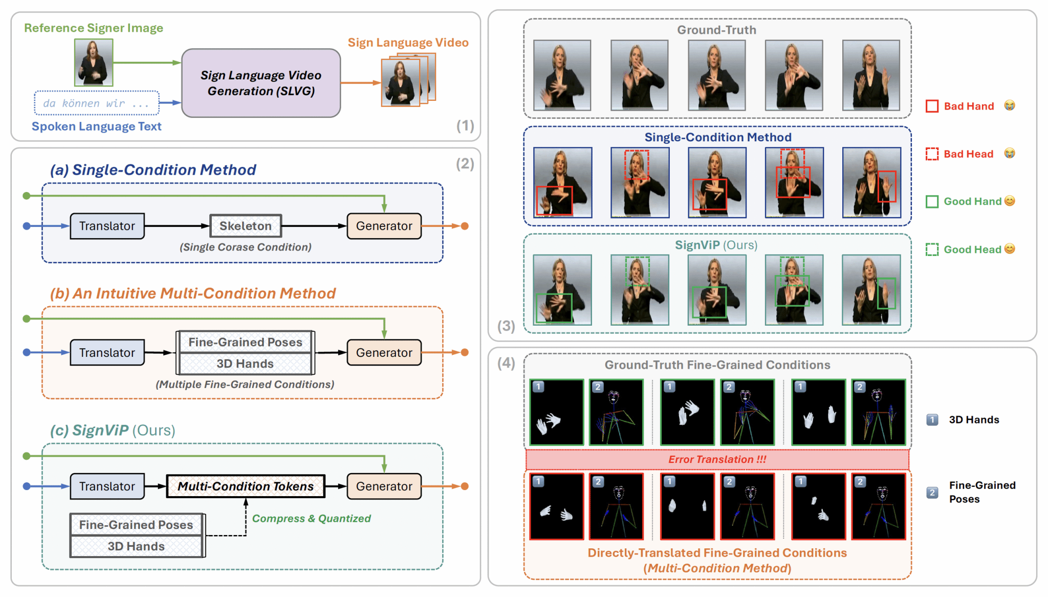Advanced Sign Language Video Generation with Compressed and Quantized Multi-Condition Tokenization. 现有的手语视频生成方法主要依赖单一的粗粒度条件(如骨骼序列)作为中间媒介,这限制了生成视频的自然度和表现力。为了克服这些局限性,本研究工作提出了SignViP框架,通过引入多种细粒度条件(如细粒度姿态和3D手部特征)来显著提升生成视频的保真度。考虑到直接从文本翻译高维连续条件极易出错,SignViP采用了一种离散词元化范式来有效集成和表示这些细粒度条件。具体而言,该框架首先利用多条件词元翻译器将口语文本转化为离散的多条件控制词元,随后通过有限标量量化自编码器将其解码为连续嵌入,最终注入到手语视频扩散模型中以引导视频生成。实验结果表明,SignViP在视频质量、时序连贯性和语义保真度等多个关键指标上均达到了目前最先进的性能。
