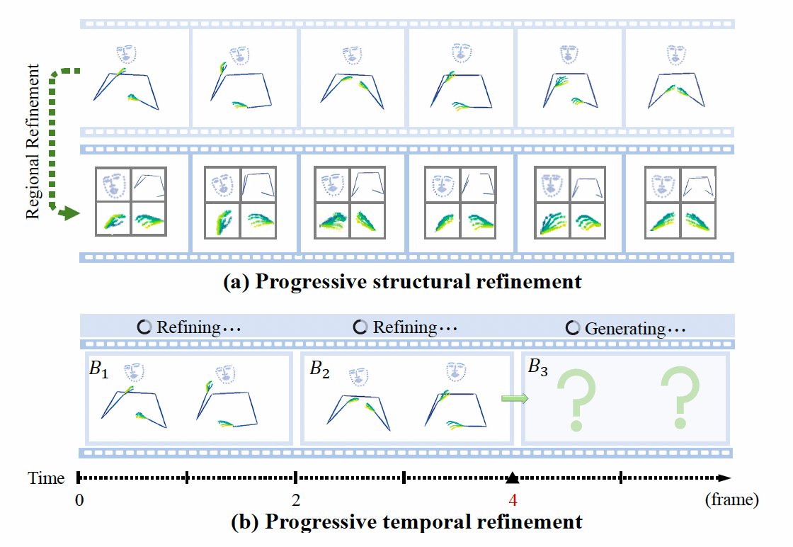 SignPR: A Progressive Vector-Quantized Diffusion Framework for Sign Language Production。手语生成旨在将自然语言文本转换为手语序列,是促进听障人与健听人之间无障碍交流的重要技术之一。针对现有方法在结构建模和时间建模上的不足,该研究工作提出了结构渐进优化与时间渐进优化相结合的生成框架:一方面,设计结构化向量量化自编码模块,从语义层和区域层对手语姿态进行离散表示,先建模整体语义,再细化身体、双手和头部等关键区域的动作细节;另一方面,提出块级因果扩散推理策略,在生成过程中逐步增强时序因果约束,并对已生成片段进行迭代修正,从而有效减轻动作抖动和帧间不连续问题。该研究工作在 Phoenix14T、CSL-Daily 和 USTC-CSL 三个公开数据集上开展实验,结果表明,该方法在多个评价指标上优于已有方法,展现出更强的语义准确度、更高的动作精度和更好的时序连贯性。