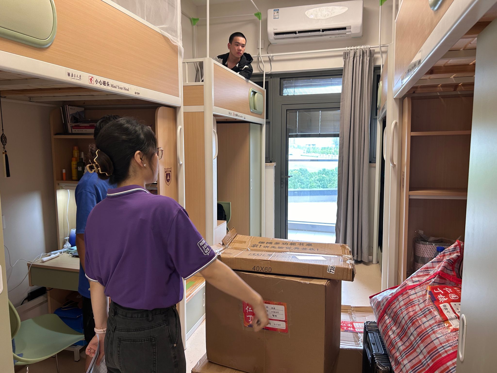 在报到工作开展的同时,行李搬运也在热火朝天地进行。烈日炎炎下,一部分学长来到托运行李的暂存处,帮助新同学把大件行李搬运上楼。智软同学们的宿舍门把手上,已提前由志愿者挂好“欢迎回家”的门挂,充满着温馨。当天下午,辅导员杨佳静老师带领2022级学长学姐到宿舍看望同学们,同学们对新宿舍表达了喜爱,热切憧憬着未来在苏州校区的学习生活。