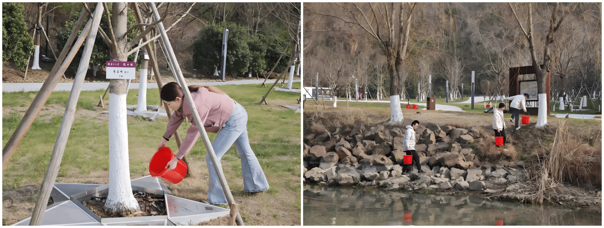 浇水组的同学手持水桶,从池塘中舀起水,将水细心浇灌在树根周围。除草组的同学动作麻利,将树根周围的杂草一一除去,统一装进桶中。除了体力劳动,团支书还特别举办了一场植树节知识竞赛。竞赛内容紧密围绕全国两会关于生态文明建设的议题,涵盖植树节的主题、植树造林的重要性、绿色生活方式的实践等。同学们积极参与,竞相抢答,现场气氛热烈而庄重。通过竞赛,同学们不仅增长了知识,更加深了对绿色发展的理解和认同,进一步坚定了走绿色发展道路的决心。
