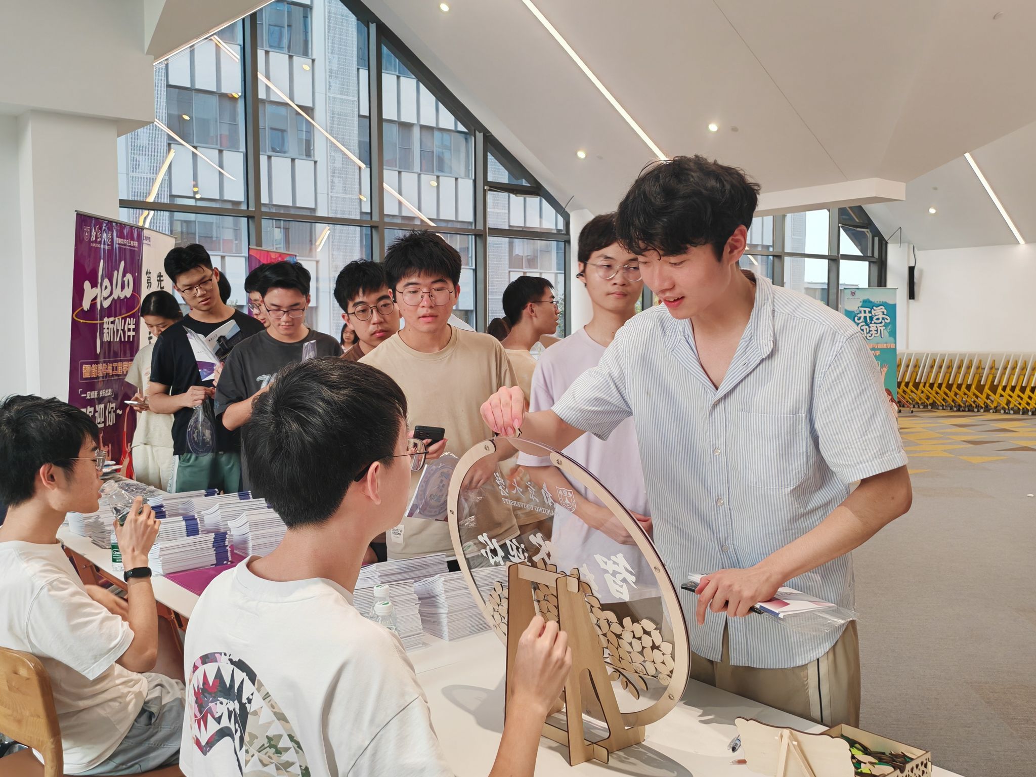在迎新展台,学院为每位同学精心准备了文创钥匙扣、清凉凉扇和书香书签等迎新礼包,以及满载辅导员和学长学姐手写祝福的特别贺卡,传递着智软院大家庭的关怀与祝福。大家在打卡相框前合影,定格初见的喜悦,也记录启程的瞬间。